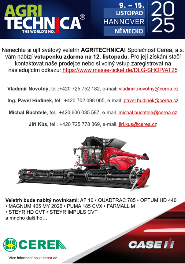 Nenechte si ujít den plný inspirace. Středa 12. listopadu ponese označení International Farmers Day. Pro české návštěvníky je v tento den připraven odborný program zaměřený na specifické potřeby našich zemědělců a jedinečná možnost získat vstup na veletrh zcela ZDARMA. Kontaktujte naše prodejce, kteří vám zajistí volný vstup nebo použijte následující odkaz: www.messe-ticket.de/DLG-SHOP/AT25/Register. Pro získání vstupenky zdarma zadejte tento kód: AT25IFDCZ. V dalším kroku je potřeba zvolit „Day Ticket International Farmers’ Day“. Už se stačí jen zaregistrovat a vstupenka je vaše.