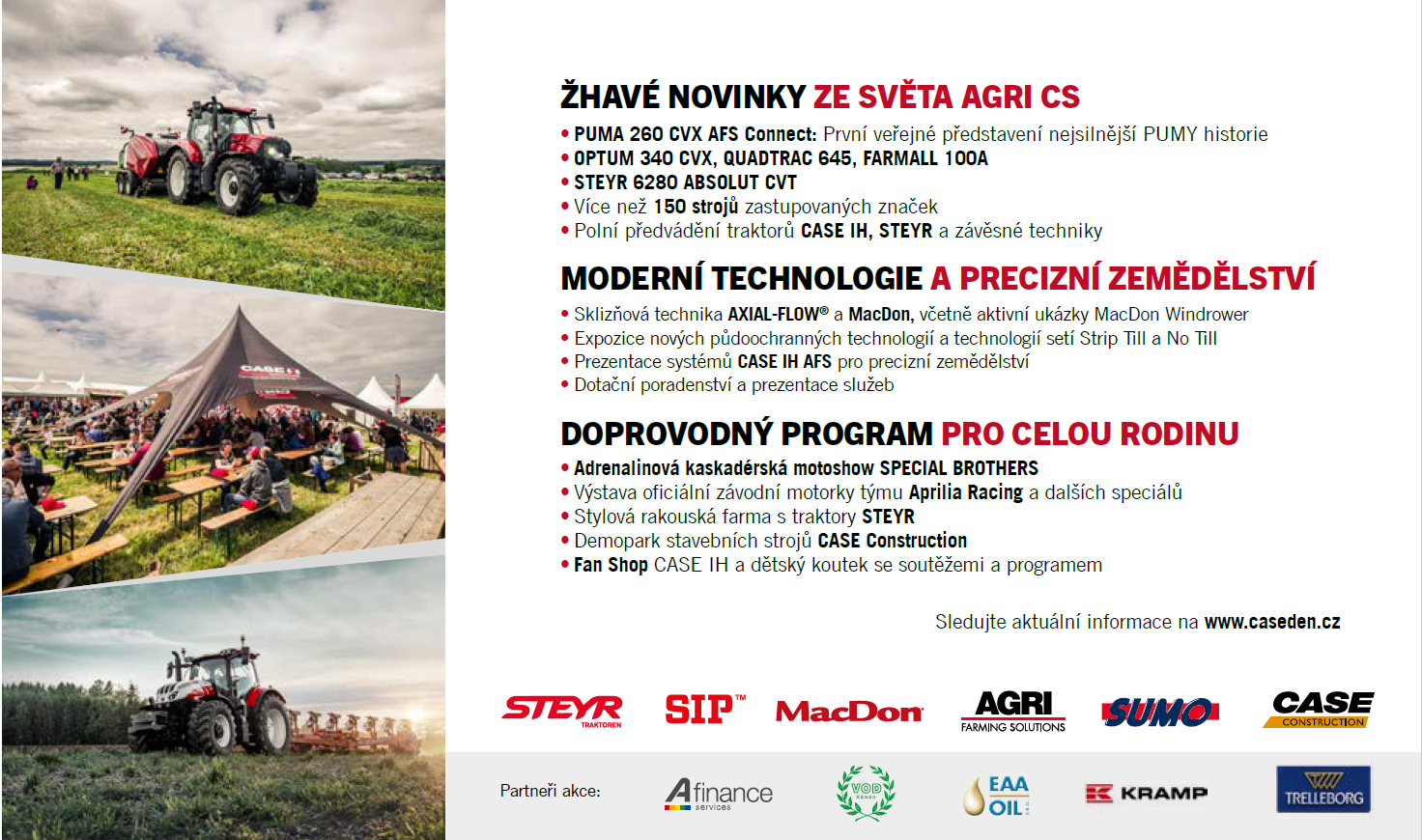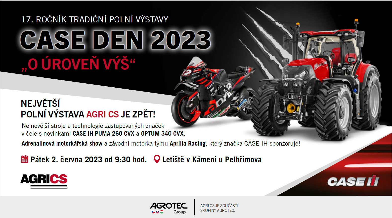 Největší polní výstava AGRI CS je zpět! V pátek 2. června od 9:30 na letišti v Kámeni u Pelhřimova se uskuteční dlouho očekávaná akce CASE DEN 2023. Na 17. ročníku vás čekají žhavé novinky ze světa zemědělské techniky, moderní technologie i bohatý doprovodný program, který si užije celá rodina. Tento ročník tradiční polní výstavy přinese nejnovější stroje a technologie zastupovaných značek v čele s novinkami značky CASE IH PUMA 260 a OPTUM 340. Můžete se těšit také na adrenalinovou motorkářskou show a závodní motorku týmu Aprilila Racing, který značka CASE IH sponzoruje.