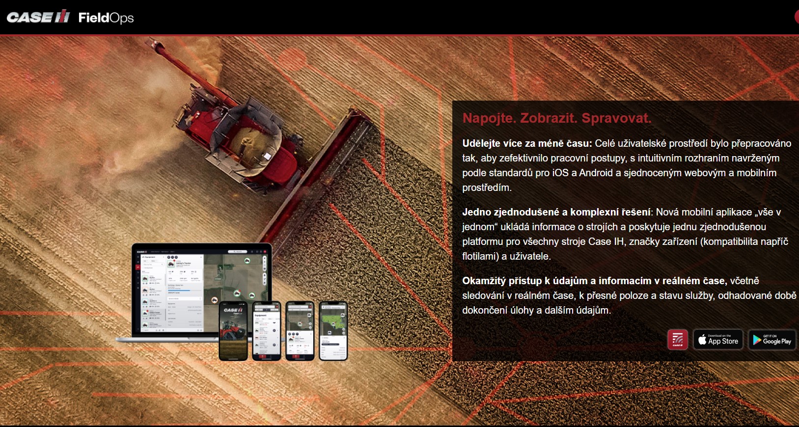 S novou aplikací Case IH FieldOps™ můžete snadno řídit svoje stroje a zlepšovat provozní efektivitu farmy odkudkoli, s přístupem k datům v reálném čase a s doživotním připojením. V dnešním rychle se měnícím zemědělství potřebují farmáři technologie, které jim usnadní práci a pomohou lépe využívat jejich zdroje. S novou aplikací Case IH FieldOps™ můžete mít veškerá potřebná data o vaší farmě a strojích doslova na dosah ruky, a to kdykoli a odkudkoli.