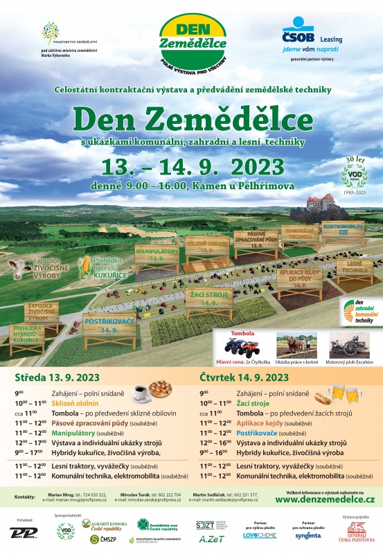 Tradiční polní výstava v Kámeni, založená především na aktivním předvádění zemědělských strojů všech značek, se blíží a vy můžete být u toho….přijměte pozvání na tuto jedinečnou akci, která se koná ve dnech 13.-14.9. na letišti v Kámeni u Pelhřimova, vždy od 9 do 16 hodin. Společnost Agri CS zde bude prezentovat nejen své novinky, mezi které bezpochyby patří nový TOP model, Puma 260 CVX Drive AFS Connect, ale čeká vás tu i tématický fotokoutek s motorkou značky Aprilia, kterou CASE IH sponzoruje v rámci závodů MotoGP. Připravený bude také stánek s ukázkami moderních technolgií precizního zemědělství značek CASE IH a STEYR, kde se vám budou věnovat odborníci na tuto tématiku a kde rozhodně nebudou chybět ani naši prodejci. Navštěvníci budou mít jedinečnou možnost vidět stroje a techniku přímo v akci, předvádět se budou, mimo jiné, sklízecí mlátičky CASE IH AF 9250 s lištou MacDon FD 235 a AF 6150 s lištou 3050, nejsilnější manipulátor CASE IH Farmlift 742, lesní traktor Steyr 4100 Multi s navijákem IGLAND 2x6 t Pronto, nová žací kombinace SIP DISC HD 1000 D FS se shazovacími pásy a SIP SILVERCUT DISC 300F FSC a secí stroj SUMO DTS 3. Toto vše a ještě mnohem více bude k vidění na celostátní zemědělské výstavě techniky Den Zemědělce 2023, proto neváhejte a přijďte se na vlastní oči přesvědčit. Níže naleznete program akce.