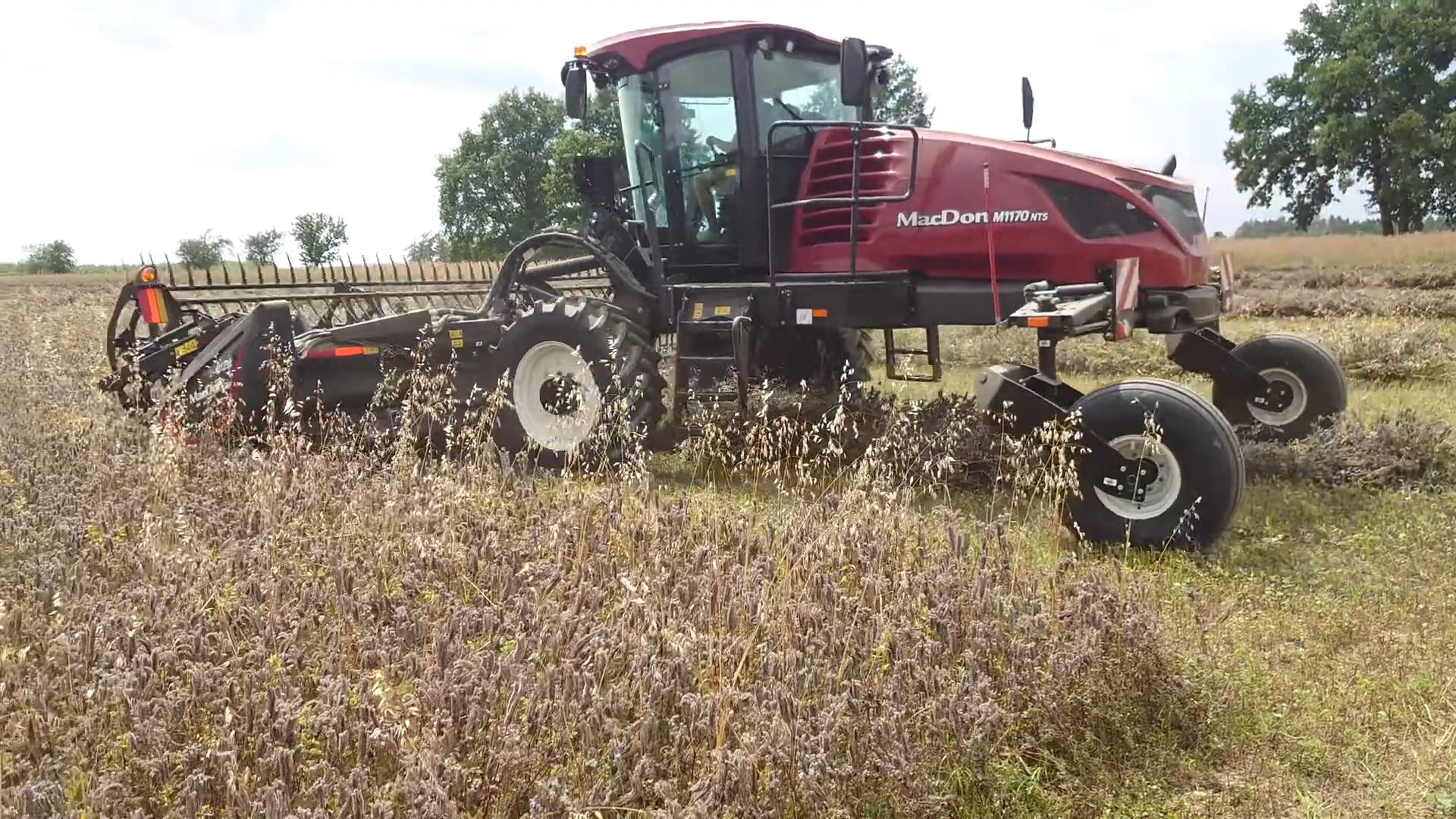 První fáze – sklizeň svazenky vratičolisté pěstované na semeno pomocí MacDon WINDROWER M1170 NT5....