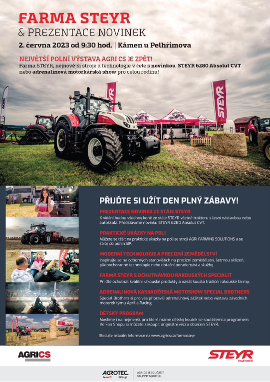 V pátek 2. června od 9:30 na letišti v Kámeni u Pelhřimova se uskuteční dlouho očekávaná akce CASE DEN 2023. Kromě oblíbené značky CASE IH zde budou prezentovány nejnovější stroje a technologie ostatních značek. Na největší polní výstavě AGRI CS nebude chybět ani Farma Steyr, která zde představí své inovace, a to v čele s novinkou Steyr Absolut CVT. Čekají vás praktické ukázky na poli např. s technikou SIP, inspirace pro precizní zemědělství, ochutnávky rakouských specialit, kaskadérská motoshow a nebude chybět ani zábava pro děti. Zkrátka, tuto jedinečnou příležitost byste si rozhodně neměli nechat ujít.
