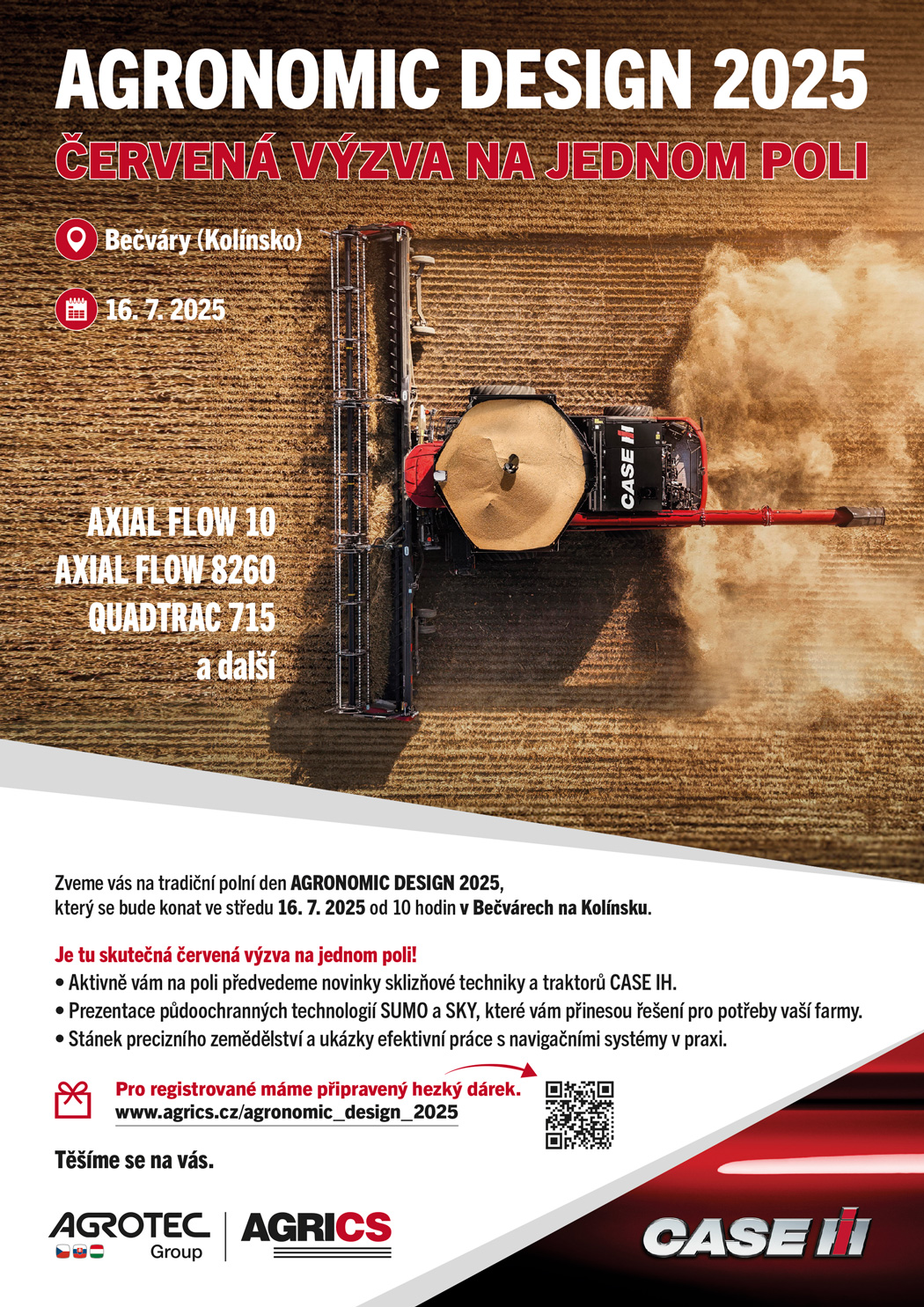 Na Polním dni AGRONOMIC DESIGN 2025 se rozpoutá červená lavina nejmodernější techniky CASE IH. Máte zájem vidět v akci a vyzkoušet si nejžhavější novinky značky Case IH jako je kombajn Axial-Flow 10, Axial Flow 8260 nebo nejsilnější traktor Quadtrac 715? Chcete prožít den plný adrenalinu a přesvědčit se o síle strojů, které mění pravidla hry? Přijďte ve středu 16. 7. 2025 v 10 hod na pole v Bečvárech na Kolínsku.