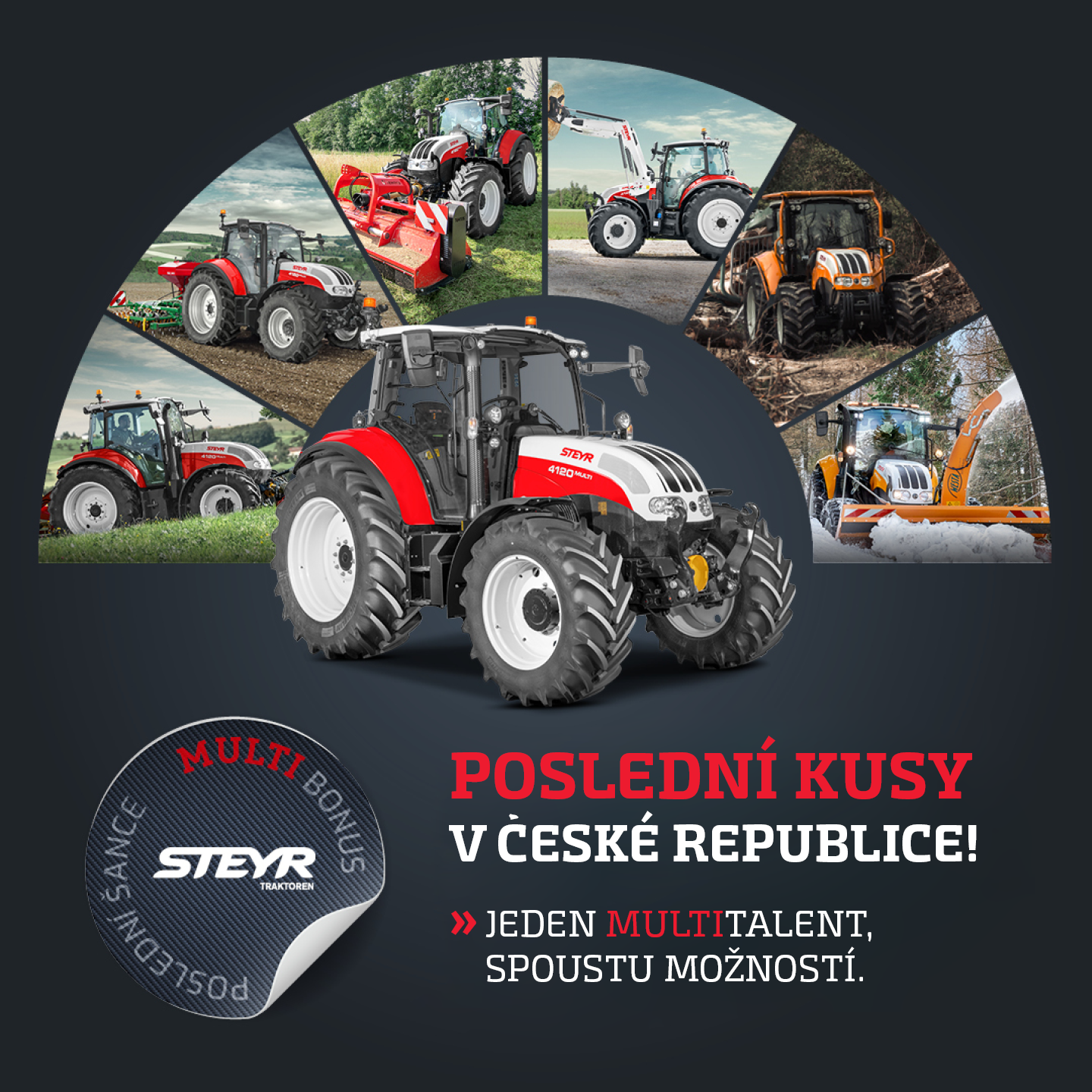 Jeden z nejoblíbenějších koní opouští rakouskou stáj. Do ČR a SK dorazí posledních 10 kusů! Neváhejte, máte jedinečnou příležitost usednout za volant legendárního modelu, který se zkrátka hodí pro jakoukoliv práci. STEYR Multi, přezdívaný Multitalent, je v Rakousku považován za srdcovou záležitost. Díky jeho univerzálnímu použití, všestrannosti a kompaktním rozměrům si získal přízeň i českých a slovenských zákazníků. Bohužel, jeden z nejoblíbenějších koní opouští nadobro rakouskou stáj. Do České republiky a na Slovensko dorazí pouze posledních 10 kusů! Neváhejte a usedněte právě vy za volant tohoto legendárního traktoru, ať už pořebujete pomocníka na své farmě, na poli, pro práci s čelním nakladačem nebo do lesa či komunálu. Kromě exkluzivní ceny si navíc můžete vybrat speciální bonus - dodatečnou slevu na stroj v hodnotě 2 000 €, slevu na přední TBZ nebo čelní nakladač Steyr S Loader od CNH za super cenu. A aby toho nebylo málo, na traktor Multi lze čerpat dotaci (Zahájení činnosti mladého zemědělce anebo Investice do zemědělských podniků), se kterou vám můžeme pomoci společně se specializovaným oddělením Afinance. Akce je platná pouze do 30. 6. 2024 nebo do vyprodání posledních kusů. Proto nečekejte a kontaktujte včas některého z našich prodejců.