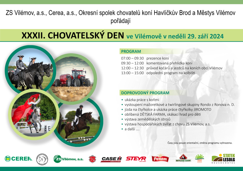 Nenechejte si ujít letošní již dvaatřicátý ročník a přijďte si s celou rodinou užít bohatý program. V neděli 29. září se koná tradiční Chovatelský den ve Vilémově, který je zaměřen především na krásné koně, ale připravena je i zábava pro děti, dobré jídlo a pití. Najdete zde samozřejmě výstavu naší zemědělské techniky, kterou si budete moci prohlédnout opravdu zblízka.