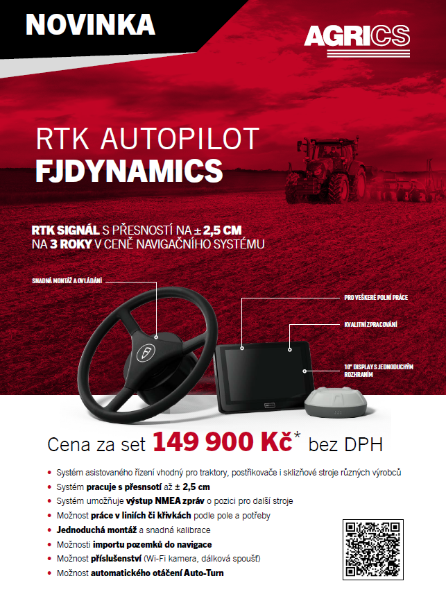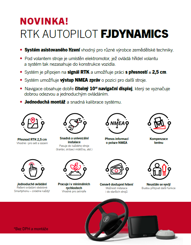 Na trh přichází novinka RTK AUTOPILOT FJDYNAMICS, přesný systém asistovaného řízení vhodný pro traktory, postřikovače i sklizňové stroje různých výrobců za bezkonkurenční cenu.FJDynamics Autosteering Kit je automatický systém řízení vhodný pro různé výrobce zemědělské techniky. Umožňuje přesný asistenční systém řízení a zároveň může být v budoucnosti upraven na řízení autonomní. Balíček je složen z ovládacího terminálu, 2 satelitních antén, 4G a rádio antény, elektrického volantu a snímačů. Systém je připojen na signál RTK a umožňuje práci s přesností 2,5 cm.