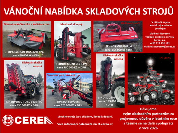 Společnost Cerea, a.s., pro vás připravila speciální vánoční nabídku nové závěsné techniky za bezkonkurenční ceny. Všechny stroje jsou skladem a připraveny k okamžitému dodání – žádné čekání. V případě zájmu kontaktujte naše prodejce.