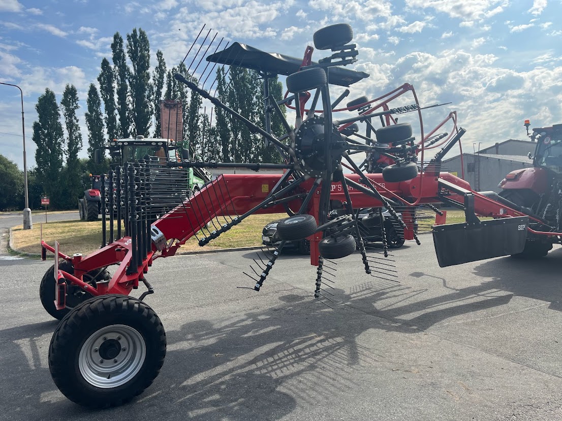 Hydraulický dvourotorový shrnovač píce se stranovým řádkem. Díky konstrukčnímu provedení lze dle druhu píce vytvářet buď velký dvojitý řádek nebo dva menší samostatné řádky.
